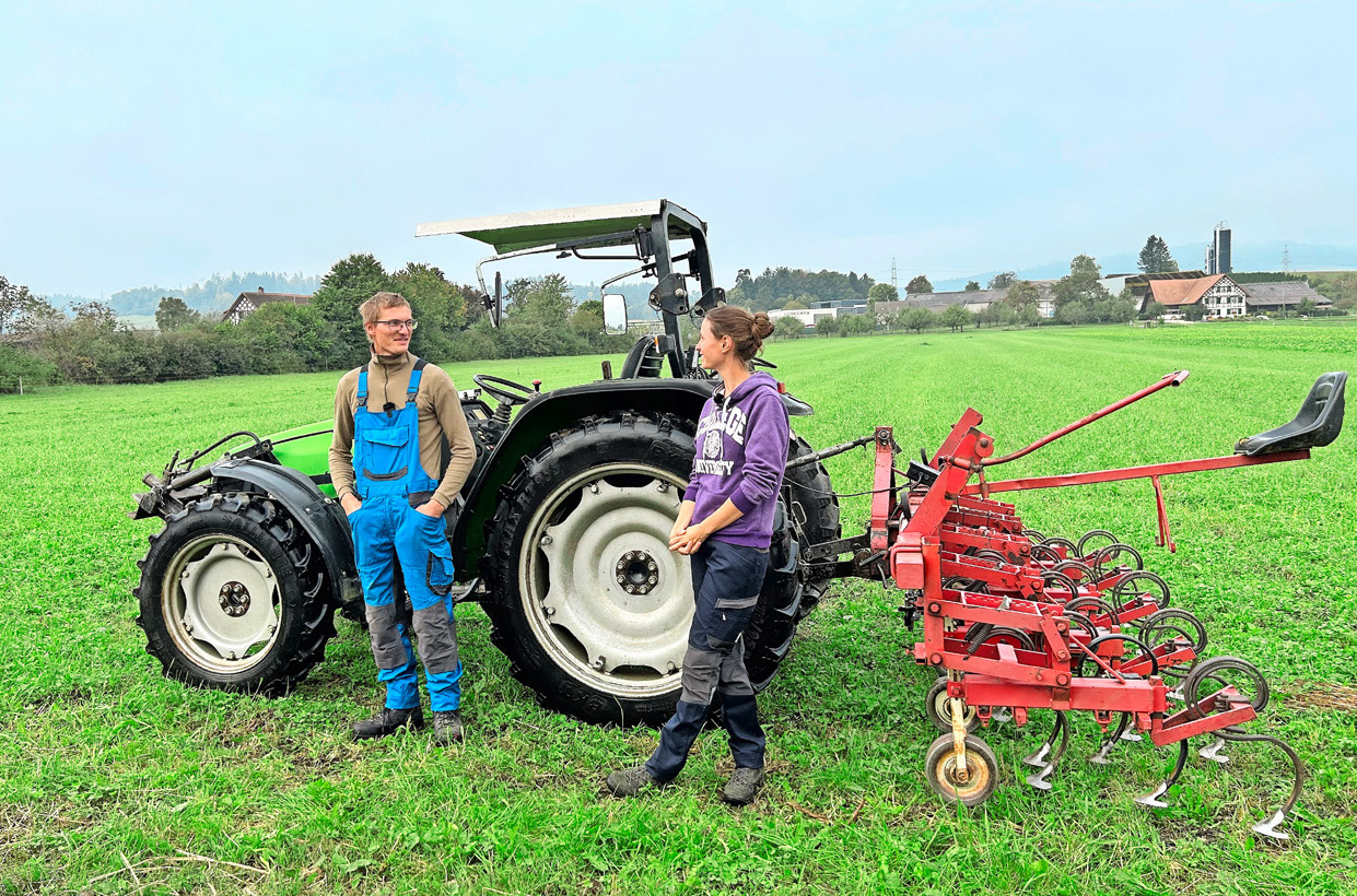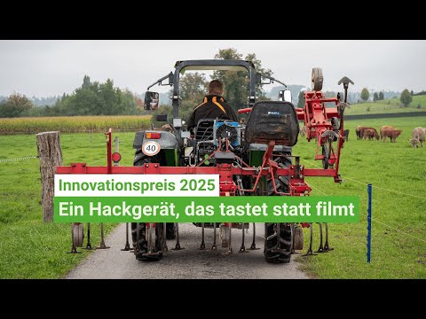 Simon und Hanna Rindlisbacher haben durch «Upcycling» den zweiten Platz im bäuerlichen Innovationswettbewerb 2025 erzielt. Er hat ein altes Hackgerät mit Tastarmen ausgerüstet, die dafür sorgen, dass in der Reihe gehackt wird. Niemand braucht zusätzlich hinten auf dem Sitz die Scharen zu lenken.