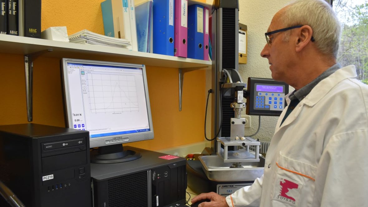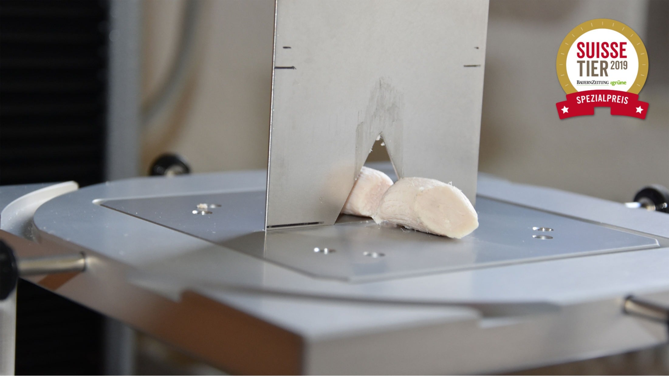 Die Methode, mit der die beiden Merkmale Zartheit und Kochverlust an Fleisch von Schweinen aus der Leistungsprüfung routinemässig gemessen werden können, wurde im Fleischlabor der SUISAG entwickelt. Dafür wird ein definiertes Stück aus dem Rückenmuskel der Schweine standardisiert gegart und der entstandene Wasserverlust (= Kochverlust) berechnet. Aus dem gegarten Fleisch werden zylindrische Probenstücke ausgebohrt und mit einer Materialprüfmaschine durchgeschnitten, wobei die maximal aufgewandte Kraft (= Scherkraft) gemessen wird.