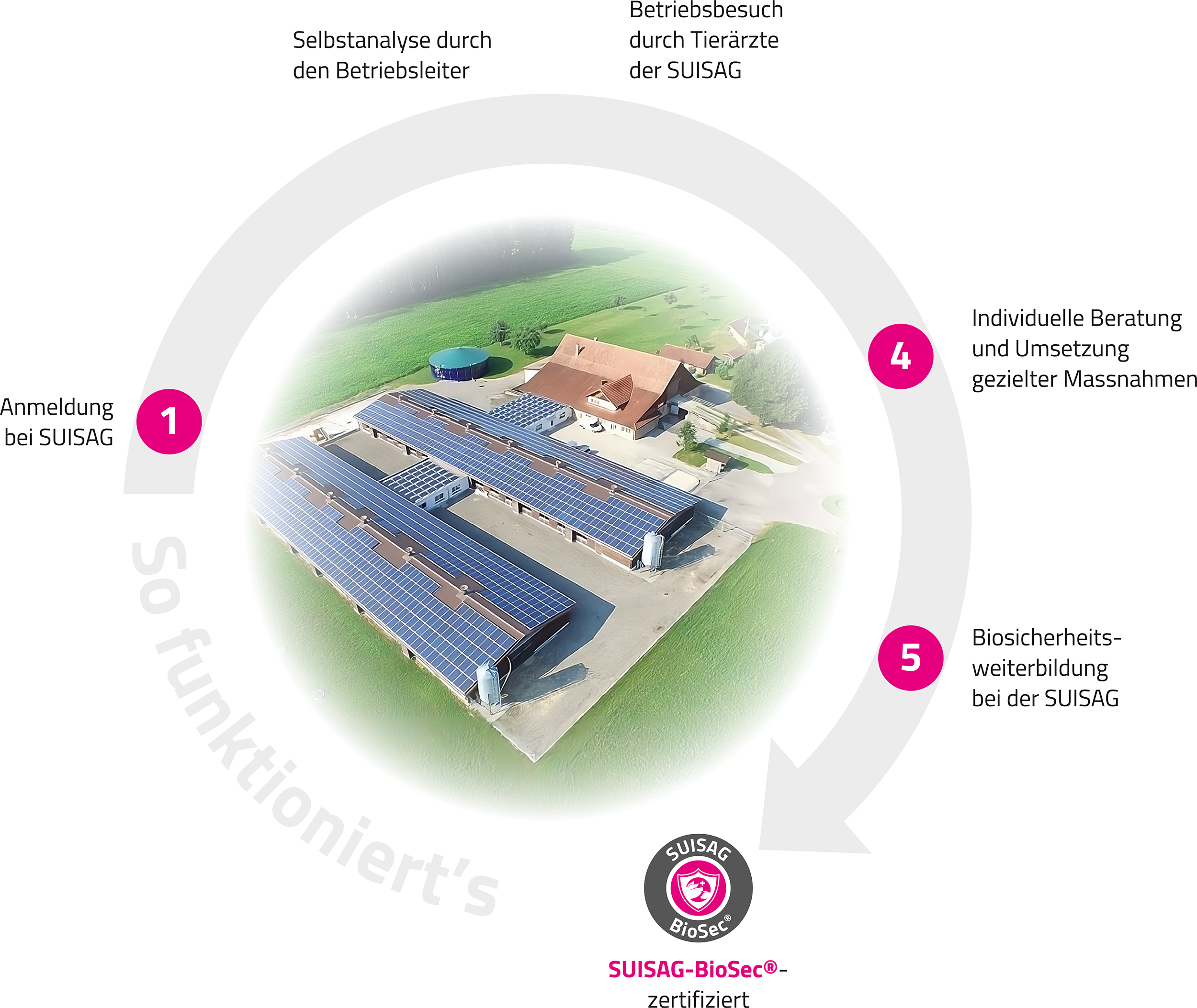 SUISAG BioSec® ist das erste umfassende Zertifizierungsprogramm für eine ausgezeichnete Biosicherheit in der Schweizer Schweinehaltung. Es kombiniert fundierte Risikoanalyse, praxisnahe Beratung, bauliche Betriebsoptimierung und Weiterbildung mit einem anerkannten Gütesiegel.