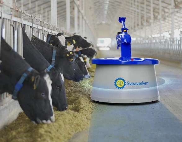Der schwedische Hersteller Sveaverken hat eine neue Generation seines Futterschiebe-Roboters Nimbo vorgestellt. Der kompakte Roboter navigiert selbstständig dank einer HD-Kamera und mit Hilfe von Infrarot und Ultraschall Sensoren - dabei passt er sich automatisch und flexibel an die Futtermenge an. Durch sein hohes Gewicht von 400kg und dank der beiden 400W starken Antriebsmotoren schiebt der NIMBO auch grössere Futtermengen zuverlässig. Der Lithium-Ionen-Akku wird an der kompakten Ladestation automatisch aufgeladen.